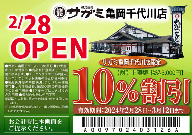 サガミ亀岡千代川店限定でご利用いただける割引券を記載いたしました。この画面を掲示で期間中、何度でもご利用いただけます。