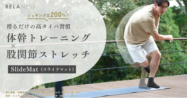 ウェルネスブランド「RELANESS」において、【日本初】のすべり止め構造を採用し、遊び感覚で10分ほど滑るだけで体幹トレーニングと股関節ストレッチが叶う「SlideMat(スライドマット)」を2024年2月22日(木)10:00よりクラウドファンディングサイト「Makuake」にて先行販売開始。先着70個限定で最大割引率の40%OFFにて購入できます。