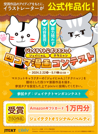 株式会社ジェイテクト(本社:愛知県刈谷市、取締役社長:佐藤和弘、以下「ジェイテクト」)は、本日2月22日より5月11日までピクシブ株式会社が運営する「pixiv」内で、ジェイテクト公式マスコットキャラクター「ジェイにゃん・テクニャン」四コマ漫画コンテストを開催いたします。