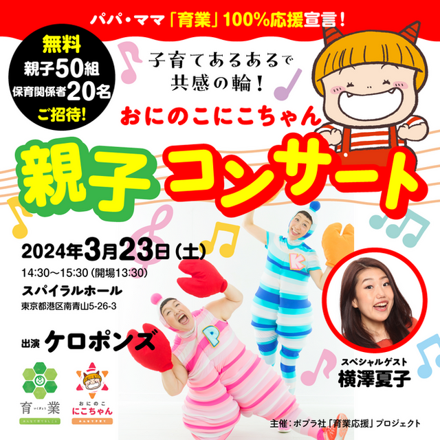 本活動の一環として、3月23日(土)に、ケロポンズ出演、スペシャルゲスト横澤夏子さんをお招きした「子育てあるあるで共感の輪! おにのこにこちゃん親子コンサート」を開催します。参加者全員に、事前に一般公募した子育てあるあるエピソードを元に作成した絵本をプレゼントします。