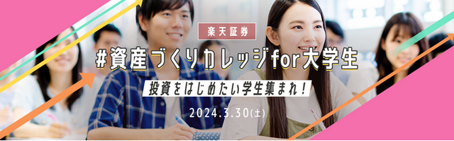 楽天証券株式会社(本社:東京都港区、代表取締役社長:楠 雄治、以下「楽天証券」)は、2024年3月30日(土)に、若年層の資産づくりをこれまで以上にサポートするため、本社(楽天クリムゾンハウス青山)にて、「資産づくりカレッジfor大学生」を開催することをお知らせします。本イベントは、楽天証券に口座をお持ちでない方を含め、すべての大学生の方が、無料で申込可能です。