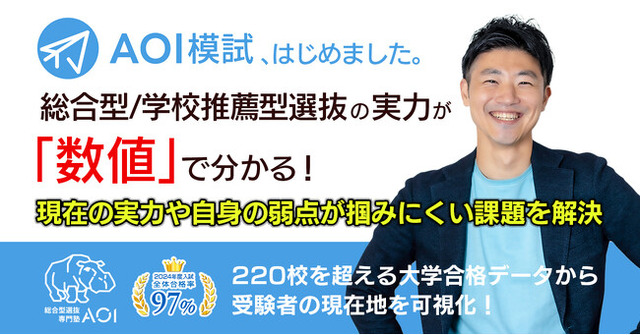 大学入試の総合型選抜(旧AO入試)の対策塾「総合型選抜専門塾AOI」(以下AOI)を運営する株式会社花形(京都府京都市、代表取締役:小澤 忠)は、総合型/学校推薦模試を実施いたします。