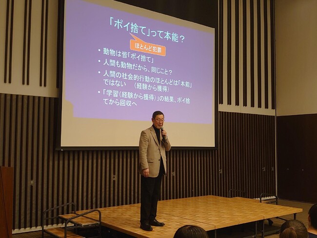 心理コンサルタントの富田隆先生による基調講演では、「なぜ、人はポイ捨てをするのか?」と題し、ポイ捨てをしてしまう人の心理や、どういうアクションがポイ捨て抑止に効果的と言われているのかなど、「行動心理学」という新たな視点から環境課題の解決に繋がるお話をしていただきました。