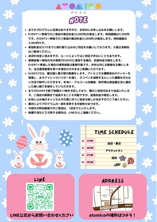 ・EVENT2では、衛生面に最大限の配慮をします。アトミコでは調理済みのクッキーを用意し、水でアイシングパウダーを溶く、デコペンを湯煎するといった調理を行わない方法で制作いただきます。手洗い・アルコール消毒後、制作時は食品衛生法に適合した使い捨て手袋をしていただきます。