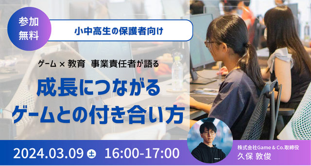 株式会社Game & Co.(本社:東京都港区、代表取締役:星 崇祥、読み:ゲームアンドコー、株式会社Brave group100%子会社、以下「Game & Co.」)は、2024年3月9日(土)16時より小中高生の保護者を対象に、「成長につながる ゲームとの付き合い方」をテーマとした無料オンラインセミナーを開催します。