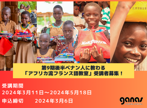 途上国に特化したNPOメディア「ganas」は12月4日の週から、アフリカのフランス語を学べて、しかもベナンの貧しい地域の子どもたちの教育も支援できる「ベナン人に教わる『アフリカ流フランス語教室』」(9期)をZoomで開講します。