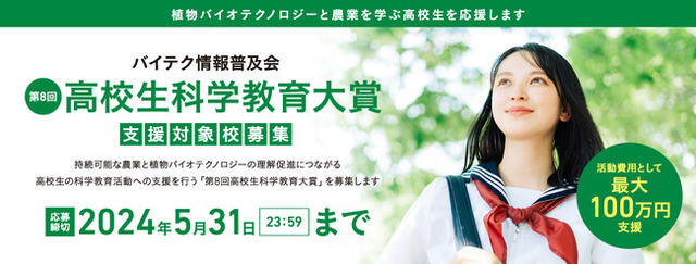 バイテク情報普及会は、高校生の農業とバイオテクノロジーの理解促進につながる科学教育活動への支援を行う「第8回高校生科学教育大賞」の支援対象校を2024年5月31日まで募集いたします。最優秀賞または優秀賞に選ばれた学校には、1校当たり100万円を上限とし、申請いただいた活動費用の一部または全額を支援いたします。