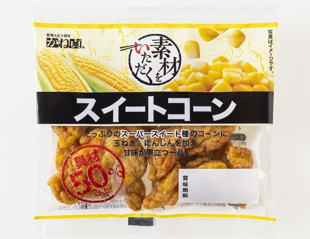 『素材をいただく スイートコーン』は、練り製品をお子様にも食べてもらいたいという思いから、子どもにとって身近で人気のある素材のコーンを採用しました。ちぎり揚げにすることで子どもがパクっと食べられ、またスイートコーンが約 50%とたっぷり入っているので、おつまみ感覚で食べられます。コーンにはスーパースイートコーンを使用し、ひとくち食べると素材の甘味を感じるかね貞一押しの逸品です。