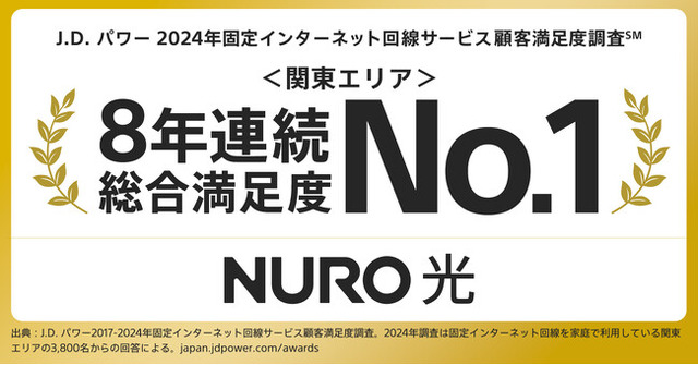 ソニーネットワークコミュニケーションズ株式会社が提供する、高速光回線サービス「NURO(ニューロ) 光」は、この度、CS(顧客満足度)に関する調査・コンサルティングの国際的な専門機関である株式会社J.D. パワー ジャパン(以下、J.D. パワー)による「J.D. パワー 2024年固定インターネット回線サービス顧客満足度調査SM」の関東エリアにおいて、総合満足度第1位を受賞しました。「NURO 光」が同調査の関東エリアにおいて総合満足度第1位を受賞するのは、2017年以降、8年連続です。