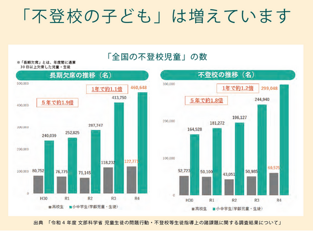 全国的に不登校児童が急増している。文部科学省の前年調査によると全国で「約30万人」の不登校児童がいる。「不登校傾向」の子どもも含めると、その数は倍以上と言われている。増加する不登校児童に対して、個別の子どもに配慮した支援の拡充が求められている。