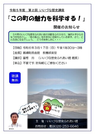 5年間のいいづな歴史ふれあい館の活動をふりかえり、講師みずからの気づきを紹介し、「町の魅力」を科学的に深掘りしていきます。さて、どんな話になるでしょう。どうぞお楽しみに・・・