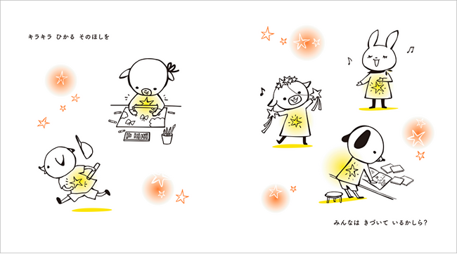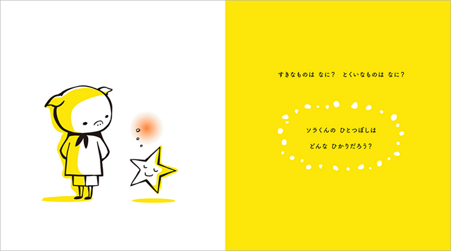 「すきな ものは なに? とくいな ものは なに?」 歌がうまかったり、走るのが速かったり、誰でも自分だけのひとつぼしを持っています。でも、まだ自分のひとつぼしに気づいていないことも。いつか光るその星は、いずれ周りを照らすほどの光になるかもしれません。2024年度、小学1年生の道徳の教科書『しょうがくどうとく 1 はばたこうあすへ』(教育出版)掲載作品。