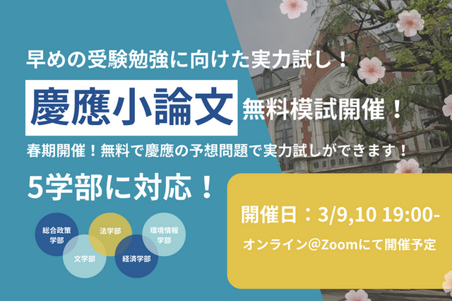 英語や社会と同様に点数が配分されている小論文、今の自分の点数と残り少ない期間の勉強方針は立てられていますか?合格に必要な勉強と自分の合格までの足りない部分、もう一度確かめてみませんか?LogicLinkでは、慶應5学部対応小論文解説講座を3月9日(土)・10日(日)に無料開催いたします。また、各学部過去10年分から分析された予想問題で、あなたの合格までの最短ルートを確認してみましょう。