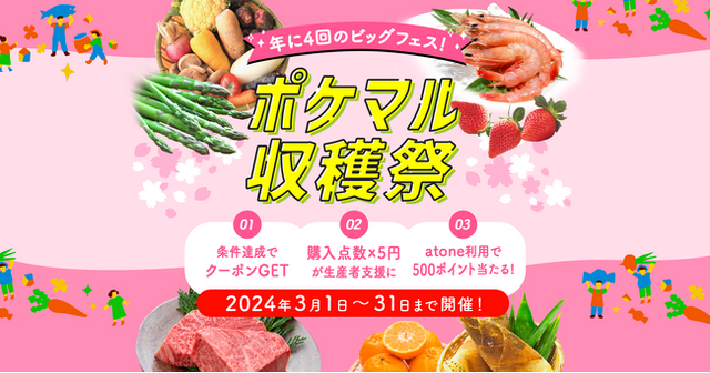 3月1日より、2024年春の大型セール「ポケマル収穫祭」を開催します。今回の収穫祭では、計3つの企画を実施します。「ポケマル収穫祭」は日本の四季に合わせて3ヶ月に1度開催します。