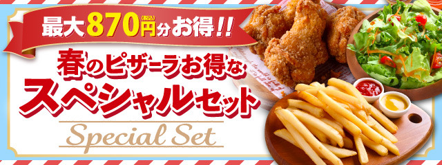 ピザーラ春の新商品が発売となる2月29日より、ピザと一緒にご注文いただけるバラエティ豊かな5種類のサイドメニューセット『春のピザーラお得なスペシャルセット』の販売を開始いたしました。全ピザ・全サイズ対象でご注文いただけるセットは、チキンやポテト、サラダなど最大で870円(税込)もお得です!