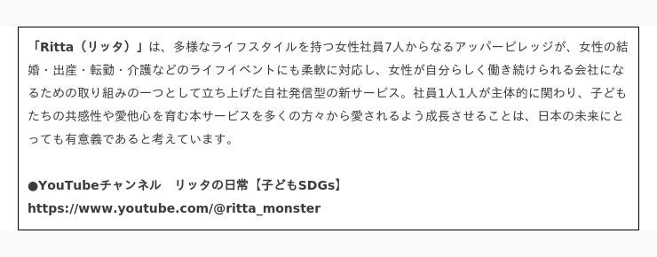 岡山のブランディングデザイン会社・アッパービレッジ有限会社(本社:岡山県岡山市、代表取締役:ムラカミヨシコ)では、2030年までに持続可能でよりよい世界を目指す国際目標(以下SDGs:Sustainable Development Goals)に基づき、親と子が一緒に学ぶことができるノンバーバルアニメーション「Ritta(リッタ)」を制作。多くの反響をいただいております。さらに、外国人留学生協力の元、【英語版】のYouTubeチャンネルも誕生いたしました。
