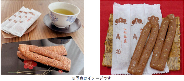 『寿松』は、京菓子である『松葉』の流れをくむ山形の伝統菓子で、水を一滴も使わず卵のみで作り焼き上げた香ばしい味のお菓子です。