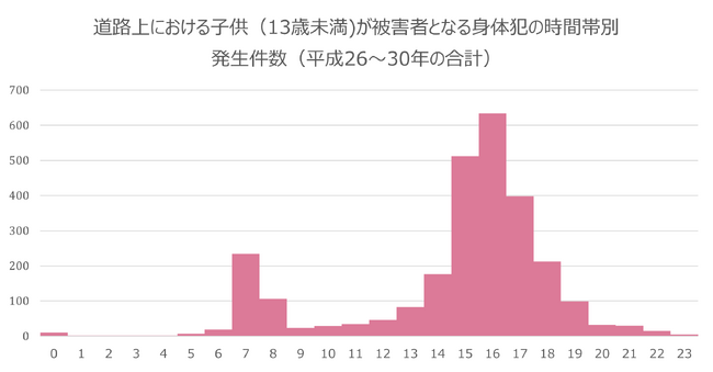 また警察庁が作成した13歳未満の子どもが被害者となる身体犯の時間帯発生件数の図(以下)をみると、やはり被害発生は登下校の時間帯に集中しており、子どもたちが外出する時間帯には犯罪に巻き込まれるリスクが高まる傾向にあることは明らかです。