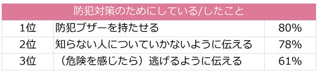 小学生以上の子どもを持つ保護者に、子どもの防犯対策のためにしたこと/していることを聞いたところ、「防犯ブザーを持たせる」(80.3%)が最も高く、次いで、「知らない人についていかないように伝える」(78.0%)、「(危険を感じたら)逃げるように伝える」(61.0%)、「(危険を感じたら)大きな声を出すように伝える」(56.0%)、「通学路を一緒に歩いて危険な場所や注意するところを教える」(45.0%)と警視庁が子どもを犯罪から守るための防犯標語「いかのおすし」に沿った防犯対策をほとんどの保護者の方が実施していることが分かりました。