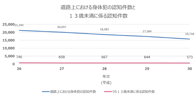 このように、徹底した防犯対策を保護者および学校、地域で子どもたちに教える活動は毎年行われていますが、13歳未満を対象とした道路上における身体犯(※)の認知件数は、全年齢を対象とした場合年々減少傾向にある一方で、残念ながらほぼ横ばいで推移している状況です。