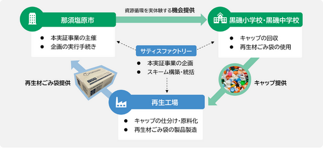資源循環を支援する株式会社サティスファクトリー(東京都中央区)は、2024年2月にPETボトルキャップ入りの再生材ごみ袋の供給を開始しました。これに先立ち、2023年12月より那須塩原市と連携して、地域内資源循環の実現可能性をはかる実証事業を行いました。本事業では、協力者である黒磯小学校と黒磯中学校にて、児童生徒がPETボトルのキャップを家庭や地域から集めました。2024年3月1日、市はセレモニーを開き、キャップを原料の一部に再生したごみ袋を学校に贈呈します。これを児童生徒が使用することで、地域内資源循環を実体験する機会となります。