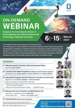 国立大学法人岡山大学(本部:岡山市北区、学長:那須保友)の大学院環境生命自然科学研究科では、日本での大学院進入学を検討している外国人の方および海外の大学関係者の方に向けて、進入学ガイダンスを開催します。(ウェビナーのオンデマンド配信)
