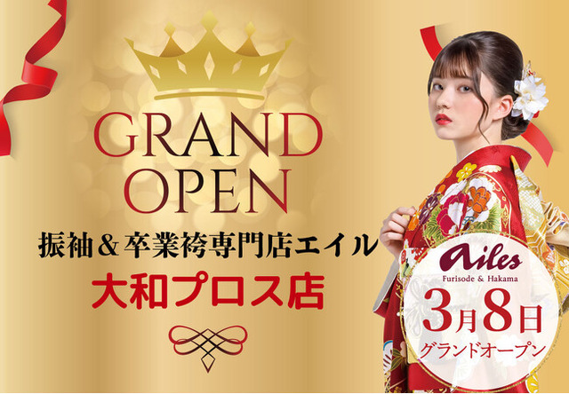 2024年3月8日に着物レンタルの旗艦店として「振袖&卒業袴専門店エイル 大和プロス店」を大和市大和東1丁目1番1号 大和プロスにグランドオープンいたします。