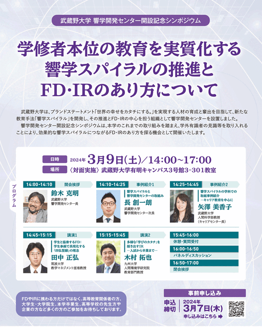 3月9日(土)にセンターの開設を記念したシンポジウム「響学スパイラルの推進とFD・IRのあり方について」を武蔵野大学有明キャンパス(江東区有明)で開催