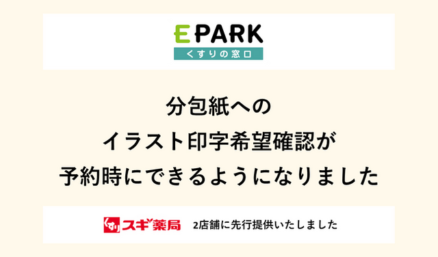 株式会社くすりの窓口(本社:東京都豊島区、代表取締役社長:堤 幸治、以下「当社」)が運営する処方せんネット受付サービス「EPARKくすりの窓口」(以下「当サービス」)では、服薬タイミングが同じ薬や粉薬などをまとめて包装する分包紙へのイラスト印字サービスの予約機能を追加し、先行提供を開始いたしましたので、お知らせいたします。