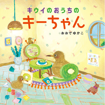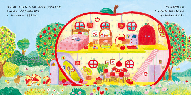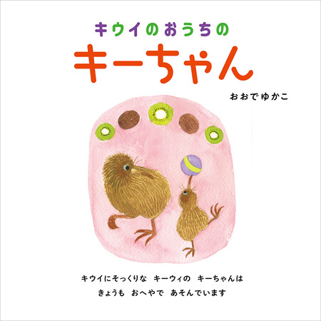 主人公は果物のキウイそっくりの鳥「キーウィ」のキーちゃん。お母さんと一緒に果物のキウイがいっぱいのお家で暮らしています。ある日、リンゴにそっくりな“リンゴどり”を見かけたキーちゃん。あとを追いかけると、たくさんのリンゴでできた家があって……。他にもバナナやイチゴなどの果物をモチーフにした動物たちの可愛らしいデザインと、細かく描きこまれた果物の家は見ごたえ十分。キーちゃんと一緒に作りたくなる、果物のおしゃれな切り方やケーキのレシピも収録。