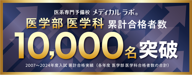 医系専門予備校として合格者数No.1(※「株式会社東京商工リサーチ」調べ/2023年度入試 医学部医学科合格者1,183名 2023年5月6日現在)、北海道~九州まで全国26校を展開する医系専門予備校メディカルラボ(河合塾グループ)は、2024年度入試の合格実績(2月24日現在)をもって、医学部医学科の累計合格者数が1万名(2007~2024年度入試累計)を突破いたしました。メディカルラボはこれからも、医学部・歯学部を志す皆さまを個別最適のきめ細やかな指導でサポートし、生徒一人ひとりを医学部・歯学部合格へ導いて参ります。