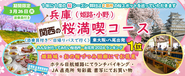 ツアー催行確定15席増席〈東大阪・八尾発着〉3月26日(火) お一人様10,800円!桜のお花見2カ所「姫路城・おの桜づつみ回廊」でお花見!!〈添乗員付き〉日帰りバスツアーのオンライン販売を開始しました。