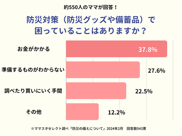今回ママスタセレクトでは「防災対策(防災グッズや備蓄品)について困っていることはありますか?」と問うアンケートを実施。回答に「準備するものがわからない」「お金がかかるのがネック」「調べたり買いに行ったりするのが手間」「その他」と4つの選択肢を設定したところ、約550人のママたちから回答が寄せられました。