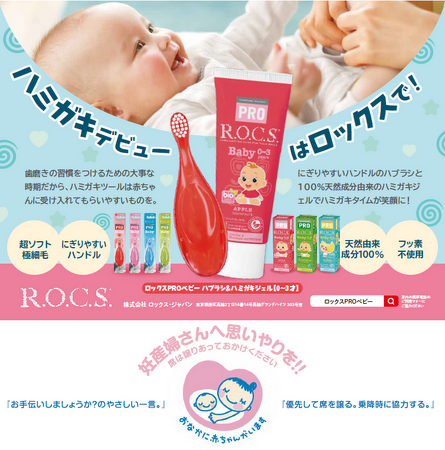 「安心、効果、安全」をブランド哲学として世界に50か国以上で販売されるオーラルケアの一大ブランド【R.O.C.S】。2018年6月に日本進出を果たした株式会社ロックス・ジャパンは、ベビーのお口のことを一番に考えた100%天然由来の歯みがき『ロックスPROベビー』&磨きはじめのベビーのお口に優しい『ロックスPROベビーハブラシ』と、厚生労働省が発行する「マタニティマーク」のタイアップ広告を2024年1月1日より1年間、都営地下鉄大江戸線、都営地下鉄三田線の車内にて掲示します。今回のタイアップ実施により、妊産婦への配慮や、やさしい環境づくりを推進する「マタニティマーク」の普及促進をサポートします。