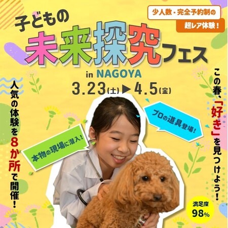 親子向けの体験型の学び事業の企画・運営を行っている株式会社ウィーケン(本社:名古屋市中区、代表:佐々木 亜由子)は、未就学児~小学生のいる親子を対象に、春休みにお仕事体験キャンペーン(『子どもの未来探究フェス』)を開催します。3/23土~4/5金の14日間の開催期間中は、9社のパートナー企業の協力のもと、仕事現場に潜入し、本物の道具やお店で、実際のプロから学ぶお仕事体験を実施。子どもたちのなりたい職業ランキングでも上位に並ぶ「動物関連」「医療関連」から、他では体験が難しい「建築関連」「芸能関連」まで、”子どもたちに豊かな体験の場を提供したい”という想いに賛同いただいたパートナー企業とともに、春休みの親子にお届けします。