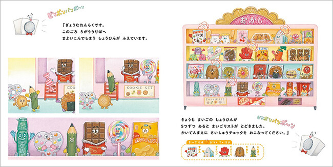 この絵本の舞台は開店前のスーパーマーケット。どうやら迷子の商品がいるようです。間違った売り場に迷い込んだ商品を探してあげてください。実際のお店をモデルに、カラフルに細かく描きこまれた売り場で探し絵遊び。野菜に果物、魚にお肉……いろいろなものの名前も覚えられます。
