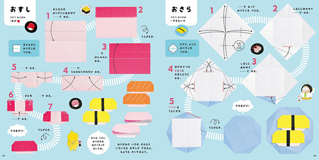 ノラネコぐんだんやマーミーちゃんをはじめ、絵本で見覚えのあるあのパンやおすし、アイスクリーム、おだんご、カレーライスなどの食べものが、市販の折り紙で簡単に作れるおりがみブック。指人形として遊べる、キャラクターの顔の形のオリジナル折り紙も付いています♪
