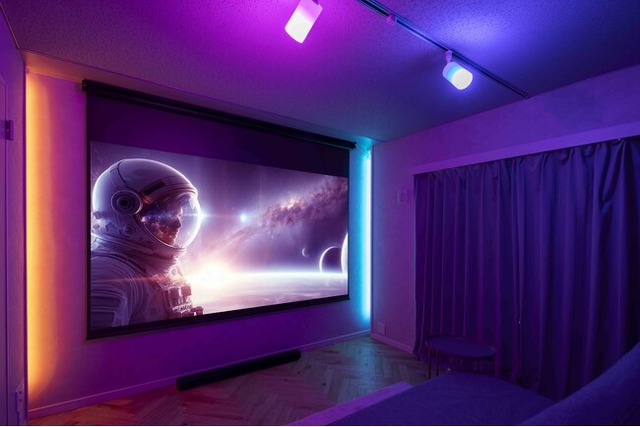 スクリーン設置壁面の間接照明と、天井スポットライト(ライトの数を増設可能)をスマートフォンで操作可能。映画鑑賞には暗く落ち着いた照明、スポーツ観戦には明るく活気ある照明といったように、光の色と明るさを自在にコントロールし、シーンや視聴するコンテンツに合わせた空間演出が実現します。