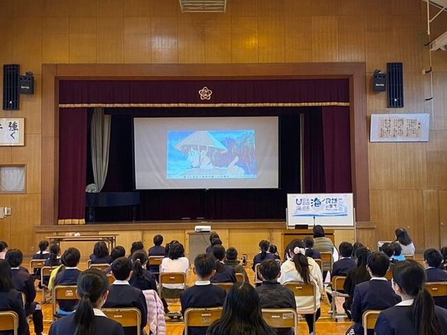 この度、愛媛県西条市を舞台にした海ノ民話アニメーション「地蔵が浜」が完成したため、2月29日(木)に西条市立庄内小学校にて全校生徒を対象にアニメの上映会を実施しました。