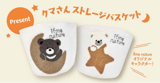 内容 :期間中に「ifme nature」商品のご購入者に「ifme nature クマさんストレージバスケット」をプレゼント(ノベルティ無くなり次第終了)