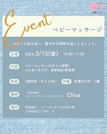 特定非営利活動法人ほっぺ(代表:大森 奈津子)は親子向けイベントとして、2024年3月15日(金)にhoppe(コーベヤスポーツ三木店3階)にて、ベビーマッサージ体験ができる「Baby Massage in hoppe」を開催いたします。