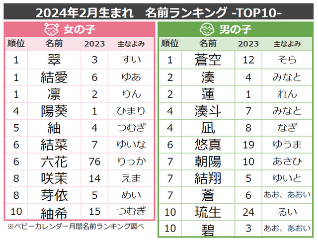 注目は、春を感じさせるような名前のよみ「こはる」。1月は30位でしたが、2月は大きく順位を上げて5位にランクイン。22位「はな」、28位「さくら」、38位「ももか」、54位「つばき」など、漢字ランキング同様、春を感じる名前「春ネーム」に人気が集まりました。