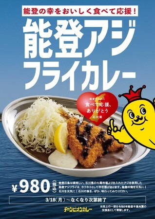 株式会社チャンピオンカレー(本社:石川県野々市市、代表取締役:南 恵太)は、2024年3月18日(月)より、限定メニューとして「能登アジフライカレー」を販売します。石川県の七尾市場より仕入れたアジを使用したアジフライをどどん!とトッピング。ホクホクの身とサクサクの衣がたまらない一品。売上金の一部は「令和6年能登半島地震」の支援金として寄附します。美味しく食べて、石川県を!能登の海を応援しよう!