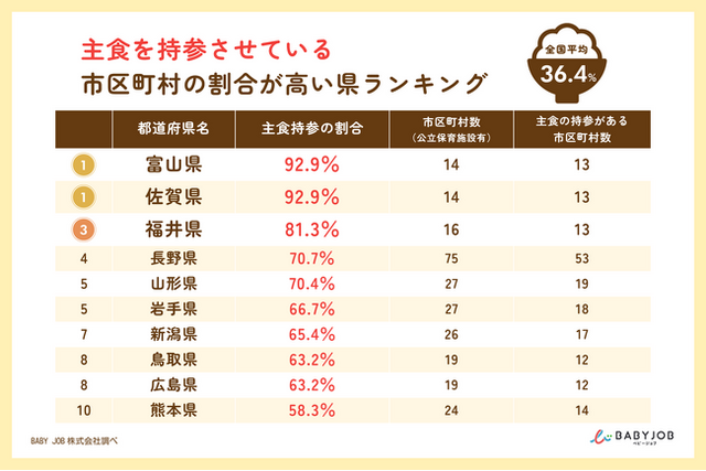 都道府県別の調査結果をみると、富山県と佐賀県では主食の持参率が9割を超える結果となりました。一方、和歌山県では27市町村全てで主食の持参がなく、代わりに保育施設で提供が行われていることがわかりました。