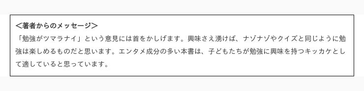 今も昔も「算数」に苦手意識のある子はたくさんいます。その理由のひとつに、算数は正解や解くスピードや点数などが目に見えてわかるため、まわりの子と比べて自分が「できない」と感じてしまいやすいことがあるようです。けれども、人と比べることなく、あまり勉強とも意識せずに、どんどん問題を解きたくなる「新しい算数」の本が誕生しました。子どもが大好きな「こわい話」と「算数」を組み合わせた、新感覚のショートストーリー集です。一見、ふつうの算数の問題ですが、解くうちに思わぬ真実が浮かび上がったり、ゾッとする話が展開されたりします。案内役の女の子・フミカちゃんの解説を読めば、算数が苦手なお子さんでも、楽しみながら基本的な算数の考え方が身につく仕組みになっています(問題は小学校中学年レベル)。