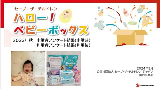 子ども支援の国際NGOである公益社団法人セーブ・ザ・チルドレン・ジャパン(理事長:井田純一郎、本部:東京都千代田区、以下セーブ・ザ・チルドレン)は、誕生時から「健康に、安心、安全な環境で育つ」といった子どもの権利を保障するため、低所得世帯の経済的負担の軽減を目的として、2023年秋に実施した「ハロー!ベビーボックス」の申請世帯及び利用世帯へのアンケート調査結果を発表しました。