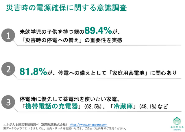 未就学児の子どもを持つ親の89.4%が、「災害時の停電への備えをする重要性」を実感