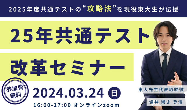 株式会社東大先生(本社:東京都新宿区 代表取締役社長:堀井崇史)の運営するオンライン家庭教師サービス「東大先生」では、「25年度共通テスト改革セミナー」を、2024年3月24日(日)16:00よりオンラインにて開催いたします。