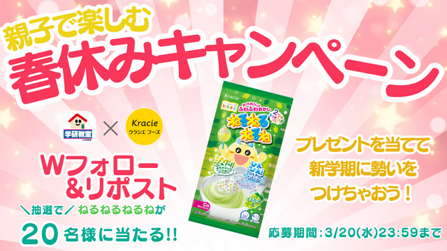 本キャンペーンでは、2024年3月15日(金)~3月20日(水)の間に学研教室公式X(旧Twitter)とクラシエ フーズ公式X(旧Twitter)をWフォロー&リポストいただいた方の中から抽選で20名様に「ねるねるねるね マスカット味」1個をプレゼントいたします。