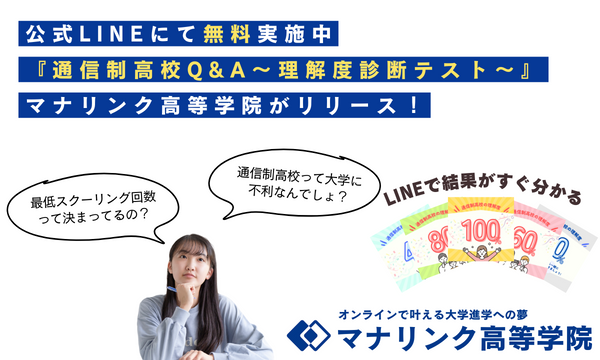 今回、マナリンク高等学院ではそのようなご家庭の疑問に応えていくべく、公式LINE追加にて誰でも無料で実施できる『通信制高校Q&A~理解度診断テスト~』をリリースしました。